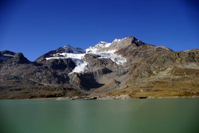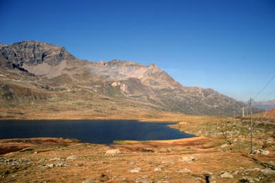 ベルニナ峠のあたりではレイネイル、ラーゴビアンコと湖の脇を進み、ガイドブックの受け売りであるが湖の名前の由来などを二人に説明しながらガイド役に徹する。 |
