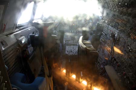 コクピット直後まで見学できますが、アクリル板は傷だらけで、写真撮影にはちょっと厳しいところです。 右のトイレも入り口はアクリル板でふさがれてます。 私も超音速中に用を足したことがある場所です。(汚い話でごめんなさい。) 機内換気のため搭乗口のドアが半開きにされていたようですが、雨などは大丈夫なのかちょっと心配になります。 |