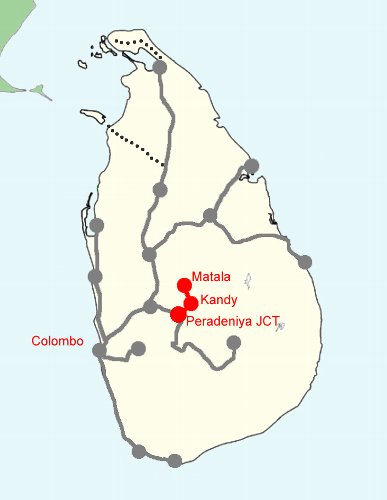 (2)Matale Line Peradeniya Junction~Kandy~Matale Main LineのPeradeniya Junctionより分岐して、観光地のKandyを経由して、MaAtaleに至る路線です。 Peradeniya Junction~Kandy間は列車本数が多いのですが、Kandy~Matale間は区間列車が一日数本走る程度となっています。 |